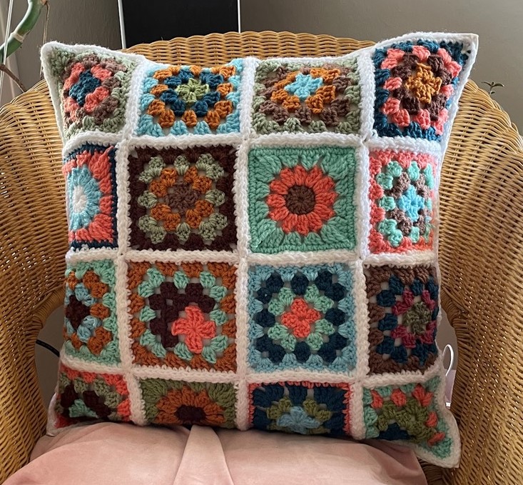 - “70s Springtime” by Ms. Caverhill & Mme. Wightmore’s Crochet Club Gr. 8 & 9 D: 20″x20″ SOLD FOR: $85