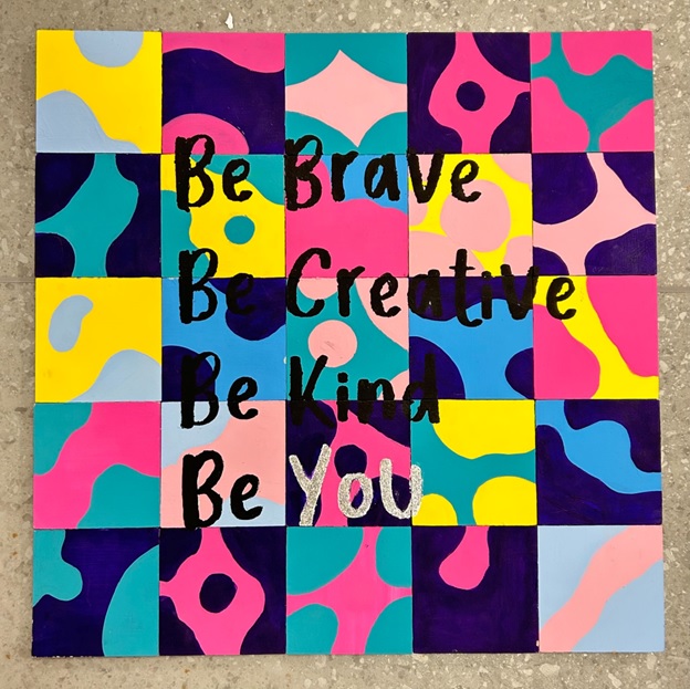 - “Be Brave, Be Creative, Be Kind, Be You” by Ms. Tran’s Gr. 1B 15″x15″ SOLD FOR: $110